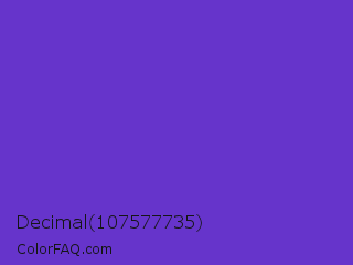 Decimal 107577735 Color is a normal indigo color and the nearest color is Purple Heart Crayola #652dc1. Hex code #6634cb and RGB value is rgb(102,52,203). In RGB color space, this color is composed of 40% red, 20% green, 80% blue, In CMYK color space, this color is composed of 50% cyan, 74% magenta, 0% yellow , 20% black , In HSL color space, this color has a hue angle of 260° , 59% saturation and 50% lightness.