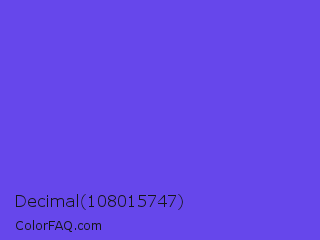 Decimal 108015747 Color is a normal indigo color and the nearest color is Majorelle Blue #6050dc. Hex code #6647eb and RGB value is rgb(102,71,235). In RGB color space, this color is composed of 40% red, 28% green, 92% blue, In CMYK color space, this color is composed of 57% cyan, 70% magenta, 0% yellow , 8% black , In HSL color space, this color has a hue angle of 251° , 80% saturation and 60% lightness.