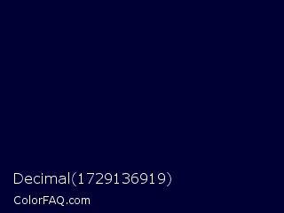 Decimal 1729136919 Color is a very dark blue color and the nearest color is Black Rock #0d0332. Hex code #000035 and RGB value is rgb(0,0,53). In RGB color space, this color is composed of 0% red, 0% green, 21% blue, In CMYK color space, this color is composed of 100% cyan, 100% magenta, 0% yellow , 79% black , In HSL color space, this color has a hue angle of 240° , 100% saturation and 10% lightness.