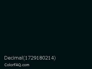 Decimal 1729180214 Color is a almost black cyan color and the nearest color is Rich Black FOGRA29 #010b13. Hex code #001114 and RGB value is rgb(0,17,20). In RGB color space, this color is composed of 0% red, 7% green, 8% blue, In CMYK color space, this color is composed of 100% cyan, 15% magenta, 0% yellow , 92% black , In HSL color space, this color has a hue angle of 189° , 100% saturation and 4% lightness.