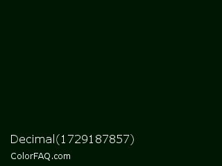 Decimal 1729187857 Color is a almost black green color and the nearest color is Midnight Moss #041004. Hex code #001803 and RGB value is rgb(0,24,3). In RGB color space, this color is composed of 0% red, 9% green, 1% blue, In CMYK color space, this color is composed of 100% cyan, 0% magenta, 88% yellow , 91% black , In HSL color space, this color has a hue angle of 128° , 100% saturation and 5% lightness.