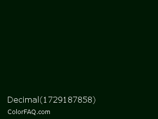 Decimal 1729187858 Color is a almost black green color and the nearest color is Midnight Moss #041004. Hex code #001804 and RGB value is rgb(0,24,4). In RGB color space, this color is composed of 0% red, 9% green, 2% blue, In CMYK color space, this color is composed of 100% cyan, 0% magenta, 83% yellow , 91% black , In HSL color space, this color has a hue angle of 130° , 100% saturation and 5% lightness.