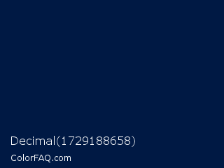 Decimal 1729188658 Color is a very dark blue color and the nearest color is Maastricht Blue #001c3d. Hex code #001944 and RGB value is rgb(0,25,68). In RGB color space, this color is composed of 0% red, 10% green, 27% blue, In CMYK color space, this color is composed of 100% cyan, 63% magenta, 0% yellow , 73% black , In HSL color space, this color has a hue angle of 218° , 100% saturation and 13% lightness.