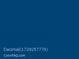 Decimal 1729257779 Color is a dark blue color and the nearest color is Deep Imperial Blue #00416a. Hex code #004375 and RGB value is rgb(0,67,117). In RGB color space, this color is composed of 0% red, 26% green, 46% blue, In CMYK color space, this color is composed of 100% cyan, 43% magenta, 0% yellow , 54% black , In HSL color space, this color has a hue angle of 206° , 100% saturation and 23% lightness.