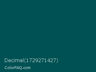 Decimal 1729271427 Color is a very dark cyan color and the nearest color is Midnight Green Eagle Green #004953. Hex code #005153 and RGB value is rgb(0,81,83). In RGB color space, this color is composed of 0% red, 32% green, 33% blue, In CMYK color space, this color is composed of 100% cyan, 2% magenta, 0% yellow , 67% black , In HSL color space, this color has a hue angle of 181° , 100% saturation and 16% lightness.