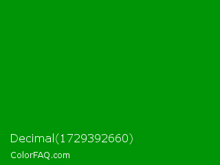 Decimal 1729392660 Color is a dark green color and the nearest color is Islamic Green #009000. Hex code #009506 and RGB value is rgb(0,149,6). In RGB color space, this color is composed of 0% red, 58% green, 2% blue, In CMYK color space, this color is composed of 100% cyan, 0% magenta, 96% yellow , 42% black , In HSL color space, this color has a hue angle of 122° , 100% saturation and 29% lightness.