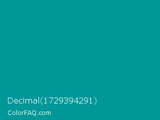 Decimal 1729394291 Color is a dark cyan color and the nearest color is Viridian Green #009698. Hex code #009799 and RGB value is rgb(0,151,153). In RGB color space, this color is composed of 0% red, 59% green, 60% blue, In CMYK color space, this color is composed of 100% cyan, 1% magenta, 0% yellow , 40% black , In HSL color space, this color has a hue angle of 181° , 100% saturation and 30% lightness.