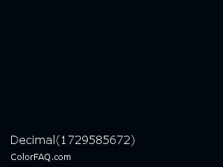 Decimal 1729585672 Color is a almost black blue color and the nearest color is Rich Black FOGRA29 #010b13. Hex code #010710 and RGB value is rgb(1,7,16). In RGB color space, this color is composed of 0% red, 3% green, 6% blue, In CMYK color space, this color is composed of 94% cyan, 56% magenta, 0% yellow , 94% black , In HSL color space, this color has a hue angle of 216° , 88% saturation and 3% lightness.