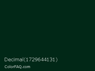 Decimal 1729644131 Color is a almost black green color and the nearest color is English Holly #022d15. Hex code #012817 and RGB value is rgb(1,40,23). In RGB color space, this color is composed of 0% red, 16% green, 9% blue, In CMYK color space, this color is composed of 98% cyan, 0% magenta, 43% yellow , 84% black , In HSL color space, this color has a hue angle of 154° , 95% saturation and 8% lightness.