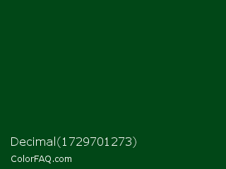 Decimal 1729701273 Color is a very dark green color and the nearest color is Crusoe #004816. Hex code #014717 and RGB value is rgb(1,71,23). In RGB color space, this color is composed of 0% red, 28% green, 9% blue, In CMYK color space, this color is composed of 99% cyan, 0% magenta, 68% yellow , 72% black , In HSL color space, this color has a hue angle of 139° , 97% saturation and 14% lightness.