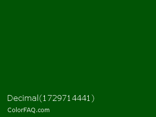Decimal 1729714441 Color is a very dark green color and the nearest color is Dark Green X11 #006400. Hex code #015405 and RGB value is rgb(1,84,5). In RGB color space, this color is composed of 0% red, 33% green, 2% blue, In CMYK color space, this color is composed of 99% cyan, 0% magenta, 94% yellow , 67% black , In HSL color space, this color has a hue angle of 123° , 98% saturation and 17% lightness.