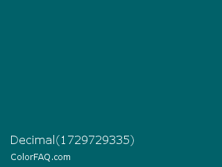 Decimal 1729729335 Color is a very dark cyan color and the nearest color is Blue Stone #016162. Hex code #016169 and RGB value is rgb(1,97,105). In RGB color space, this color is composed of 0% red, 38% green, 41% blue, In CMYK color space, this color is composed of 99% cyan, 8% magenta, 0% yellow , 59% black , In HSL color space, this color has a hue angle of 185° , 98% saturation and 21% lightness.