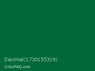Decimal 1730155319 Color is a very dark green color and the nearest color is Cadmium Green #006b3c. Hex code #016939 and RGB value is rgb(1,105,57). In RGB color space, this color is composed of 0% red, 41% green, 22% blue, In CMYK color space, this color is composed of 99% cyan, 0% magenta, 46% yellow , 59% black , In HSL color space, this color has a hue angle of 152° , 98% saturation and 21% lightness.