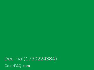 Decimal 1730224384 Color is a dark green color and the nearest color is Spanish Green #009150. Hex code #019344 and RGB value is rgb(1,147,68). In RGB color space, this color is composed of 0% red, 58% green, 27% blue, In CMYK color space, this color is composed of 99% cyan, 0% magenta, 54% yellow , 42% black , In HSL color space, this color has a hue angle of 148° , 99% saturation and 29% lightness.