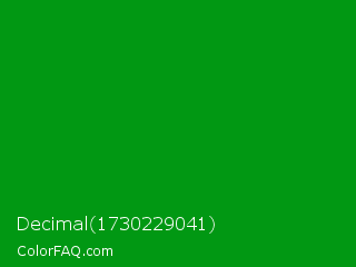 Decimal 1730229041 Color is a dark green color and the nearest color is Islamic Green #009000. Hex code #019813 and RGB value is rgb(1,152,19). In RGB color space, this color is composed of 0% red, 60% green, 7% blue, In CMYK color space, this color is composed of 99% cyan, 0% magenta, 88% yellow , 40% black , In HSL color space, this color has a hue angle of 127° , 99% saturation and 30% lightness.