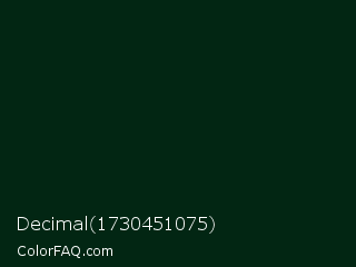 Decimal 1730451075 Color is a almost black green color and the nearest color is English Holly #022d15. Hex code #022613 and RGB value is rgb(2,38,19). In RGB color space, this color is composed of 1% red, 15% green, 7% blue, In CMYK color space, this color is composed of 95% cyan, 0% magenta, 50% yellow , 85% black , In HSL color space, this color has a hue angle of 148° , 90% saturation and 8% lightness.