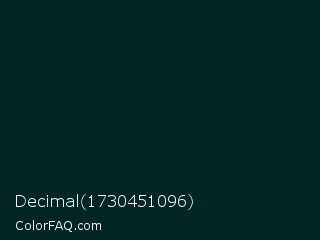 Decimal 1730451096 Color is a almost black cyan color and the nearest color is Burnham #002e20. Hex code #022622 and RGB value is rgb(2,38,34). In RGB color space, this color is composed of 1% red, 15% green, 13% blue, In CMYK color space, this color is composed of 95% cyan, 0% magenta, 11% yellow , 85% black , In HSL color space, this color has a hue angle of 173° , 90% saturation and 8% lightness.