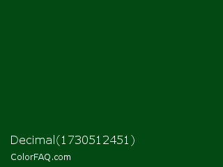Decimal 1730512451 Color is a very dark green color and the nearest color is Crusoe #004816. Hex code #024913 and RGB value is rgb(2,73,19). In RGB color space, this color is composed of 1% red, 29% green, 7% blue, In CMYK color space, this color is composed of 97% cyan, 0% magenta, 74% yellow , 71% black , In HSL color space, this color has a hue angle of 134° , 95% saturation and 15% lightness.