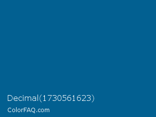 Decimal 1730561623 Color is a dark blue color and the nearest color is Bahama Blue #026395. Hex code #026091 and RGB value is rgb(2,96,145). In RGB color space, this color is composed of 1% red, 38% green, 57% blue, In CMYK color space, this color is composed of 99% cyan, 34% magenta, 0% yellow , 43% black , In HSL color space, this color has a hue angle of 201° , 97% saturation and 29% lightness.