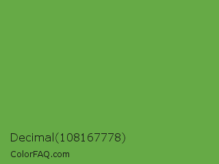 Decimal 108167778 Color is a normal green color and the nearest color is Palm Leaf #6f9940. Hex code #66aa46 and RGB value is rgb(102,170,70). In RGB color space, this color is composed of 40% red, 67% green, 27% blue, In CMYK color space, this color is composed of 40% cyan, 0% magenta, 59% yellow , 33% black , In HSL color space, this color has a hue angle of 101° , 42% saturation and 47% lightness.
