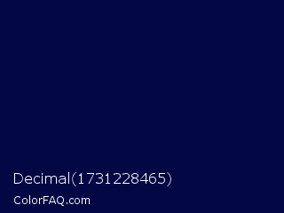 Decimal 1731228465 Color is a very dark blue color and the nearest color is Stratos #000741. Hex code #030743 and RGB value is rgb(3,7,67). In RGB color space, this color is composed of 1% red, 3% green, 26% blue, In CMYK color space, this color is composed of 96% cyan, 90% magenta, 0% yellow , 74% black , In HSL color space, this color has a hue angle of 236° , 91% saturation and 14% lightness.