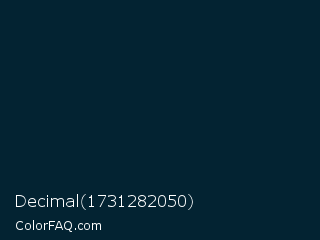 Decimal 1731282050 Color is a very dark blue color and the nearest color is Daintree #012731. Hex code #032332 and RGB value is rgb(3,35,50). In RGB color space, this color is composed of 1% red, 14% green, 20% blue, In CMYK color space, this color is composed of 94% cyan, 30% magenta, 0% yellow , 80% black , In HSL color space, this color has a hue angle of 199° , 89% saturation and 10% lightness.