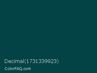 Decimal 1731339923 Color is a very dark cyan color and the nearest color is Warm Black #004242. Hex code #034345 and RGB value is rgb(3,67,69). In RGB color space, this color is composed of 1% red, 26% green, 27% blue, In CMYK color space, this color is composed of 96% cyan, 3% magenta, 0% yellow , 73% black , In HSL color space, this color has a hue angle of 182° , 92% saturation and 14% lightness.