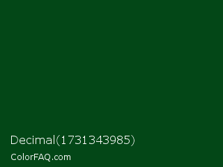 Decimal 1731343985 Color is a very dark green color and the nearest color is Crusoe #004816. Hex code #034717 and RGB value is rgb(3,71,23). In RGB color space, this color is composed of 1% red, 28% green, 9% blue, In CMYK color space, this color is composed of 96% cyan, 0% magenta, 68% yellow , 72% black , In HSL color space, this color has a hue angle of 138° , 92% saturation and 15% lightness.