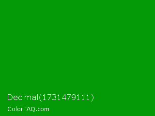 Decimal 1731479111 Color is a normal green color and the nearest color is Islamic Green #009000. Hex code #039907 and RGB value is rgb(3,153,7). In RGB color space, this color is composed of 1% red, 60% green, 3% blue, In CMYK color space, this color is composed of 98% cyan, 0% magenta, 95% yellow , 40% black , In HSL color space, this color has a hue angle of 122° , 96% saturation and 31% lightness.