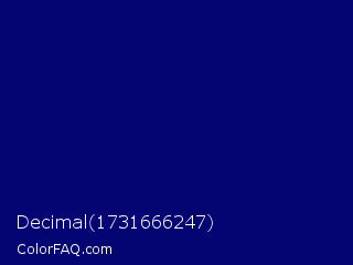 Decimal 1731666247 Color is a dark blue color and the nearest color is Navy Blue #000080. Hex code #040473 and RGB value is rgb(4,4,115). In RGB color space, this color is composed of 2% red, 2% green, 45% blue, In CMYK color space, this color is composed of 97% cyan, 97% magenta, 0% yellow , 55% black , In HSL color space, this color has a hue angle of 240° , 93% saturation and 23% lightness.