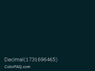 Decimal 1731696465 Color is a almost black cyan color and the nearest color is Daintree #012731. Hex code #042227 and RGB value is rgb(4,34,39). In RGB color space, this color is composed of 2% red, 13% green, 15% blue, In CMYK color space, this color is composed of 90% cyan, 13% magenta, 0% yellow , 85% black , In HSL color space, this color has a hue angle of 189° , 81% saturation and 8% lightness.