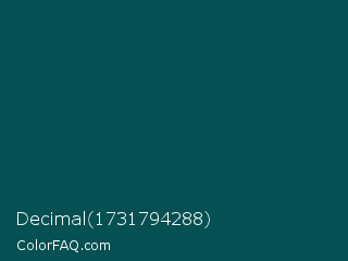 Decimal 1731794288 Color is a very dark cyan color and the nearest color is Midnight Green Eagle Green #004953. Hex code #045052 and RGB value is rgb(4,80,82). In RGB color space, this color is composed of 2% red, 31% green, 32% blue, In CMYK color space, this color is composed of 95% cyan, 2% magenta, 0% yellow , 68% black , In HSL color space, this color has a hue angle of 182° , 91% saturation and 17% lightness.
