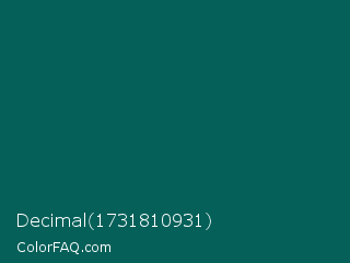 Decimal 1731810931 Color is a very dark cyan color and the nearest color is Deep Sea Green #095859. Hex code #046059 and RGB value is rgb(4,96,89). In RGB color space, this color is composed of 2% red, 38% green, 35% blue, In CMYK color space, this color is composed of 96% cyan, 0% magenta, 7% yellow , 62% black , In HSL color space, this color has a hue angle of 175° , 92% saturation and 20% lightness.