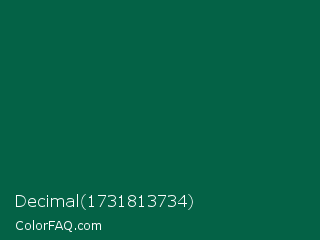 Decimal 1731813734 Color is a very dark green color and the nearest color is Bottle Green #006a4e. Hex code #046246 and RGB value is rgb(4,98,70). In RGB color space, this color is composed of 2% red, 38% green, 27% blue, In CMYK color space, this color is composed of 96% cyan, 0% magenta, 29% yellow , 62% black , In HSL color space, this color has a hue angle of 162° , 92% saturation and 20% lightness.