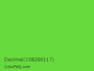 Decimal 108266117 Color is a normal green color and the nearest color is Kiwi #8ee53f. Hex code #66d93d and RGB value is rgb(102,217,61). In RGB color space, this color is composed of 40% red, 85% green, 24% blue, In CMYK color space, this color is composed of 53% cyan, 0% magenta, 72% yellow , 15% black , In HSL color space, this color has a hue angle of 104° , 67% saturation and 55% lightness.