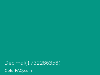 Decimal 1732286358 Color is a dark cyan color and the nearest color is Gossamer #069b81. Hex code #049784 and RGB value is rgb(4,151,132). In RGB color space, this color is composed of 2% red, 59% green, 52% blue, In CMYK color space, this color is composed of 97% cyan, 0% magenta, 13% yellow , 41% black , In HSL color space, this color has a hue angle of 172° , 95% saturation and 30% lightness.