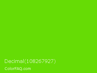 Decimal 108267927 Color is a normal green color and the nearest color is Alien Armpit #84de02. Hex code #66dc05 and RGB value is rgb(102,220,5). In RGB color space, this color is composed of 40% red, 86% green, 2% blue, In CMYK color space, this color is composed of 54% cyan, 0% magenta, 98% yellow , 14% black , In HSL color space, this color has a hue angle of 93° , 96% saturation and 44% lightness.