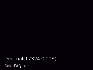 Decimal 1732470098 Color is a almost black purple color and the nearest color is Rich Black FOGRA39 #010203. Hex code #050008 and RGB value is rgb(5,0,8). In RGB color space, this color is composed of 2% red, 0% green, 3% blue, In CMYK color space, this color is composed of 38% cyan, 100% magenta, 0% yellow , 97% black , In HSL color space, this color has a hue angle of 278° , 100% saturation and 2% lightness.