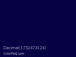 Decimal 1732473124 Color is a very dark indigo color and the nearest color is Stratos #000741. Hex code #050244 and RGB value is rgb(5,2,68). In RGB color space, this color is composed of 2% red, 1% green, 27% blue, In CMYK color space, this color is composed of 93% cyan, 97% magenta, 0% yellow , 73% black , In HSL color space, this color has a hue angle of 243° , 94% saturation and 14% lightness.