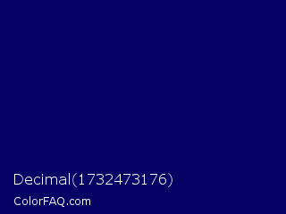 Decimal 1732473176 Color is a very dark indigo color and the nearest color is Arapawa #110c6c. Hex code #050266 and RGB value is rgb(5,2,102). In RGB color space, this color is composed of 2% red, 1% green, 40% blue, In CMYK color space, this color is composed of 95% cyan, 98% magenta, 0% yellow , 60% black , In HSL color space, this color has a hue angle of 242° , 96% saturation and 20% lightness.