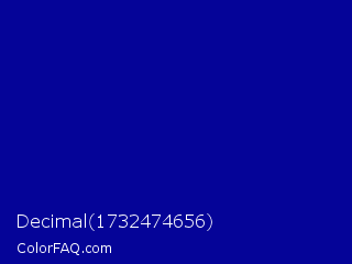Decimal 1732474656 Color is a normal blue color and the nearest color is Duke Blue #00009c. Hex code #050498 and RGB value is rgb(5,4,152). In RGB color space, this color is composed of 2% red, 2% green, 60% blue, In CMYK color space, this color is composed of 97% cyan, 97% magenta, 0% yellow , 40% black , In HSL color space, this color has a hue angle of 240° , 95% saturation and 31% lightness.