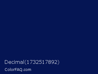 Decimal 1732517892 Color is a very dark blue color and the nearest color is Gulf Blue #051657. Hex code #051554 and RGB value is rgb(5,21,84). In RGB color space, this color is composed of 2% red, 8% green, 33% blue, In CMYK color space, this color is composed of 94% cyan, 75% magenta, 0% yellow , 67% black , In HSL color space, this color has a hue angle of 228° , 89% saturation and 17% lightness.