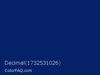 Decimal 1732531026 Color is a very dark blue color and the nearest color is Deep Sapphire #082567. Hex code #052268 and RGB value is rgb(5,34,104). In RGB color space, this color is composed of 2% red, 13% green, 41% blue, In CMYK color space, this color is composed of 95% cyan, 67% magenta, 0% yellow , 59% black , In HSL color space, this color has a hue angle of 222° , 91% saturation and 21% lightness.