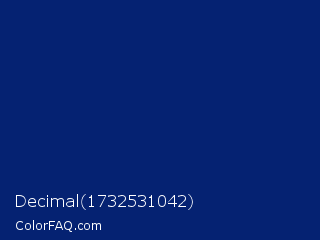 Decimal 1732531042 Color is a dark blue color and the nearest color is Catalina Blue #062a78. Hex code #052272 and RGB value is rgb(5,34,114). In RGB color space, this color is composed of 2% red, 13% green, 45% blue, In CMYK color space, this color is composed of 96% cyan, 70% magenta, 0% yellow , 55% black , In HSL color space, this color has a hue angle of 224° , 92% saturation and 23% lightness.