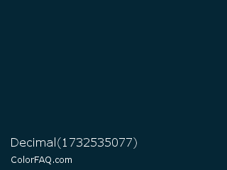 Decimal 1732535077 Color is a very dark blue color and the nearest color is Daintree #012731. Hex code #052635 and RGB value is rgb(5,38,53). In RGB color space, this color is composed of 2% red, 15% green, 21% blue, In CMYK color space, this color is composed of 91% cyan, 28% magenta, 0% yellow , 79% black , In HSL color space, this color has a hue angle of 199° , 83% saturation and 11% lightness.