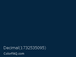 Decimal 1732535095 Color is a very dark blue color and the nearest color is Oxford Blue #002147. Hex code #052641 and RGB value is rgb(5,38,65). In RGB color space, this color is composed of 2% red, 15% green, 25% blue, In CMYK color space, this color is composed of 92% cyan, 42% magenta, 0% yellow , 75% black , In HSL color space, this color has a hue angle of 207° , 86% saturation and 14% lightness.