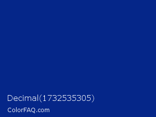 Decimal 1732535305 Color is a dark blue color and the nearest color is Resolution Blue #002387. Hex code #052689 and RGB value is rgb(5,38,137). In RGB color space, this color is composed of 2% red, 15% green, 54% blue, In CMYK color space, this color is composed of 96% cyan, 72% magenta, 0% yellow , 46% black , In HSL color space, this color has a hue angle of 225° , 93% saturation and 28% lightness.