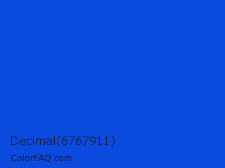 Decimal 6767911 Color is a normal blue color and the nearest color is Blue RYB #0247fe. Hex code #0a4adf and RGB value is rgb(10,74,223). In RGB color space, this color is composed of 4% red, 29% green, 87% blue, In CMYK color space, this color is composed of 96% cyan, 67% magenta, 0% yellow , 13% black , In HSL color space, this color has a hue angle of 222° , 91% saturation and 46% lightness.