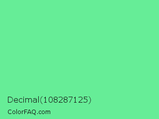 Decimal 108287125 Color is a light green color and the nearest color is Very Light Malachite Green #64e986. Hex code #66ed97 and RGB value is rgb(102,237,151). In RGB color space, this color is composed of 40% red, 93% green, 59% blue, In CMYK color space, this color is composed of 57% cyan, 0% magenta, 36% yellow , 7% black , In HSL color space, this color has a hue angle of 142° , 79% saturation and 66% lightness.