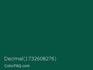 Decimal 1732608276 Color is a very dark cyan color and the nearest color is Sacramento State Green #00563f. Hex code #055442 and RGB value is rgb(5,84,66). In RGB color space, this color is composed of 2% red, 33% green, 26% blue, In CMYK color space, this color is composed of 94% cyan, 0% magenta, 21% yellow , 67% black , In HSL color space, this color has a hue angle of 166° , 89% saturation and 17% lightness.